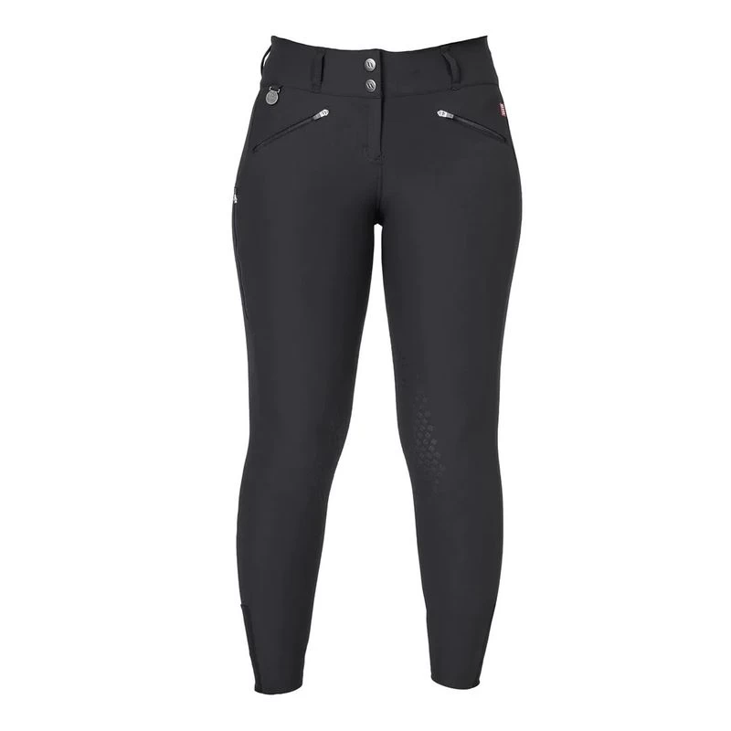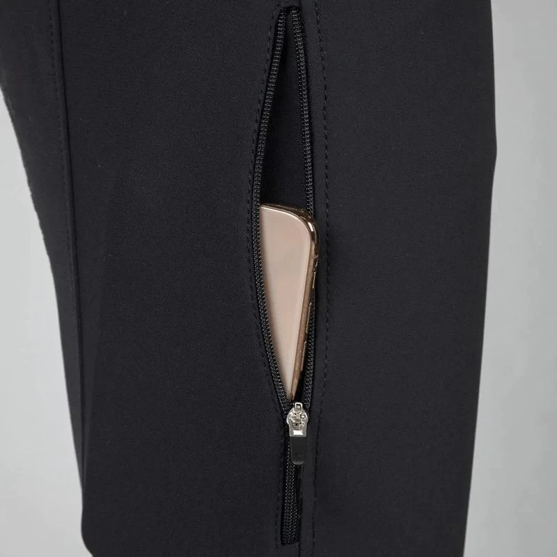 The design around the hip section provides the best possible fit helping to minimize rider fatigue and adding to comfort in the saddle. The waist is elastic with a medium waistband that follows the contour of the lumbar spine for extra support where it is needed most. The side seam on the outside of the leg is positioned to relieve pressure on the kneecap. Mesh stretch panels provide a secure fit around the calf and ankle. The knee patch has an innovative and durable grip system. The pockets are a thin breathable material: a flexible mobile phone pocket and two front pockets with zippers.