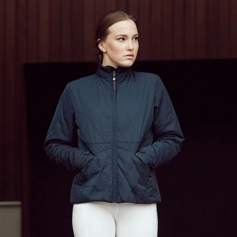 The slim cut and asymmetrical quilting at the waist ensure a flattering silhouette. The jacket’s inner pocket is equipped with a dedicated headphone jack.