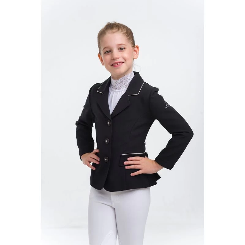 The Crystal Purity Show Jacket has been designed with crystals and a special cut with unique pleated bottom. Made out of 8 different sections on the back for the perfect fit for children. Made of a stretch fabric which allows great movement when riding. Decorated with silver piping along the collar, on the pockets and belt imitation on the back as well as fine crystals.