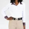 The Cathrine is made of stretchy and breathable tech fabric. There are elastic mesh inserts on the front and sleeves that add interest and extra breathability. It has decorative placket buttons and discreet rose gold crystal applications.