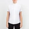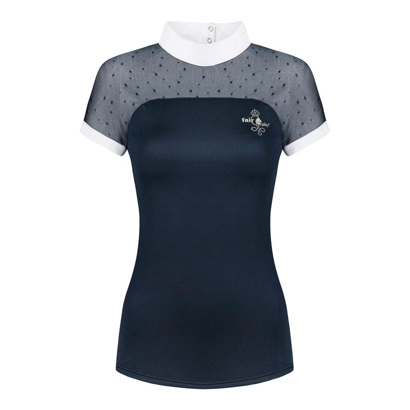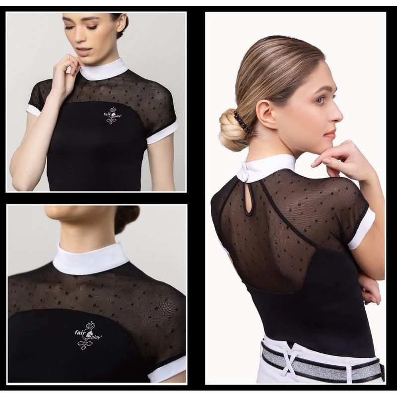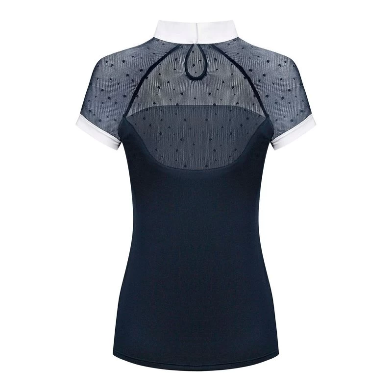 This simple, yet elegant show shirt features a stretch dotted mesh insert that give a lace look and excellent breathability. The stretch tab collar is perfect alone in the jumper arena or add a stock tie for dressage. The balance of the shirt is made of a soft, stretch technical fabric that is super comfortable and moisture wicking.