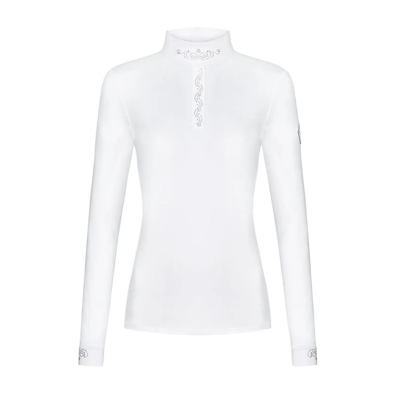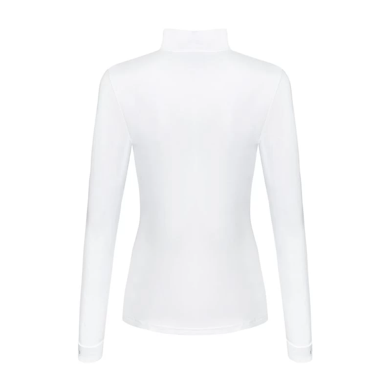 The Meredith is made of stretchy, elastic, and breathable tech fabric. Not just an athletic shirt, the Meredith is good looking too! It is decorated with discreet crystal applications on the collar, front and cuff. No need for a stock tie here!