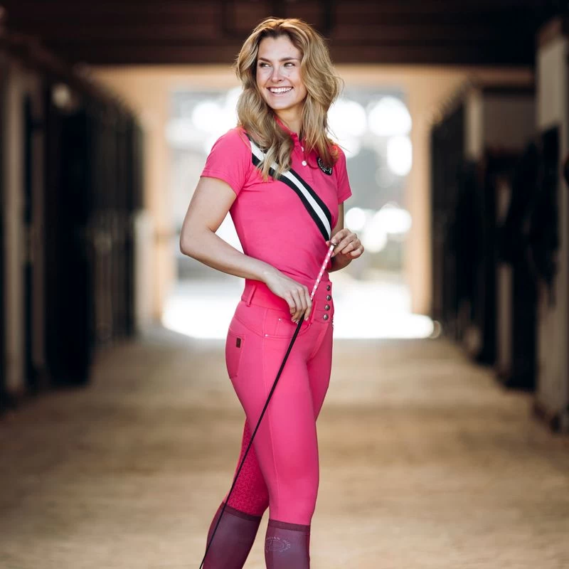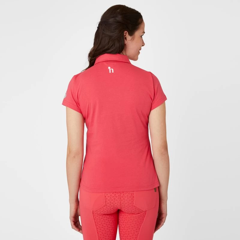 The Horze Jessie t-shirt is made from breathable material that is perfect for your daily rides. The sporty design with collar and contrasting stripe easily matches your riding wardrobe. Press buttons at the placket provide additional ventilation when needed. The embroidery on the chest looks timeless and chic. Wear this jersey shirt riding, in the stables or in your free time. It can easily be combined with breeches, tights or jeans.
