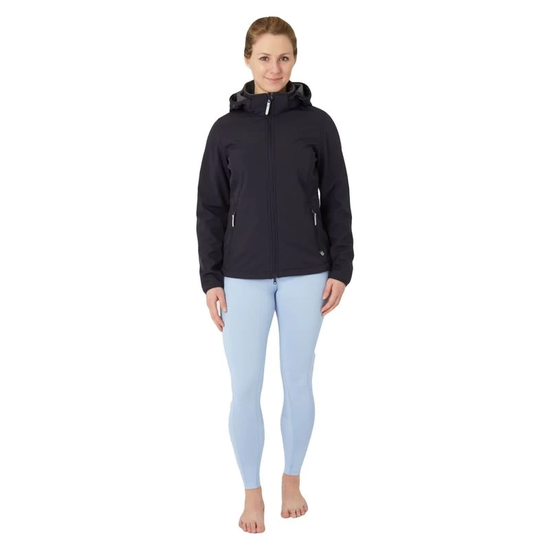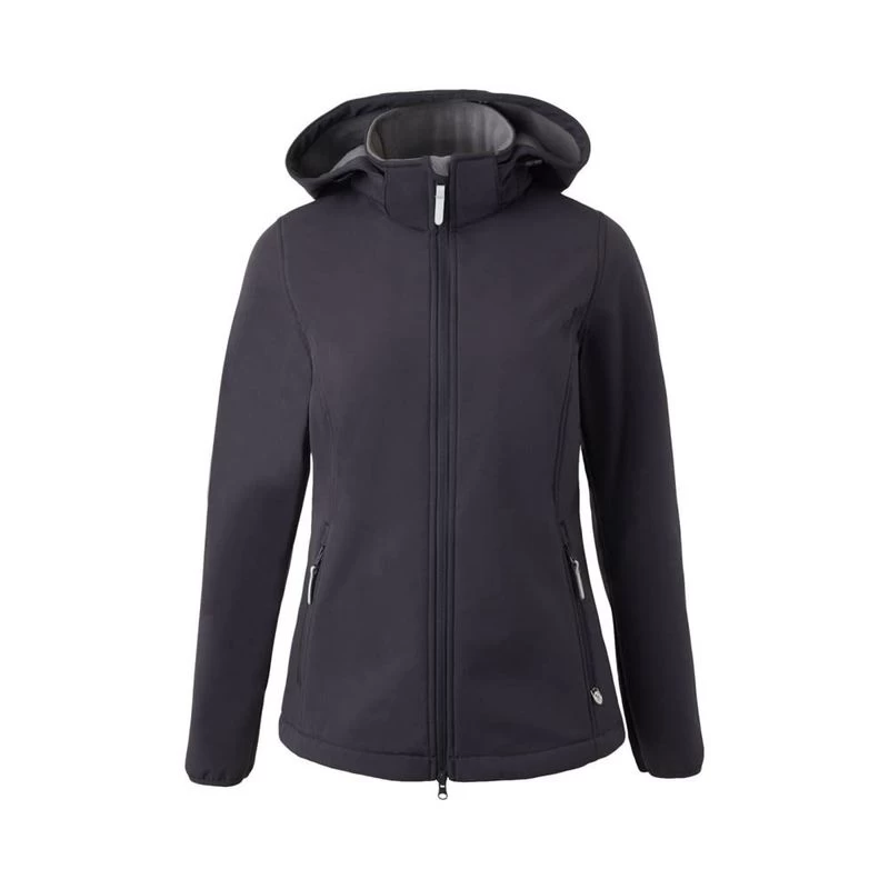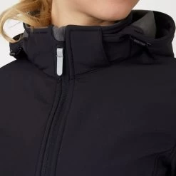 This functional yet stylish women’s softshell jacket with a soft fleece lining in contrasting color is the perfect option for layering or warmer spring days. It’s also a comfortable companion during short rain showers, thanks to the waterproof fabric and the hood (which can also be detached with a zipper). The two-way front zip make the jacket perfectly suitable for riding and the spacious zipper pockets allow you to stow away keys or your phone while being at the stables. The drawstring inside the back waist panel creates a flattering figure if tightened.