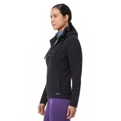 Full zip styling with luscious, plush fleece inside and a soft, matte exterior that sheds hay and dirt. Stretch panels free you to reach for forelocks and carve a flattering, feminine silhouette. Pop the hood on this tech top for post-ride warmth, but even hood down, the extra tall collar keeps you cozy. Two front hand-warmer pockets, plus a bonus inner pocket to keep your phone handy.