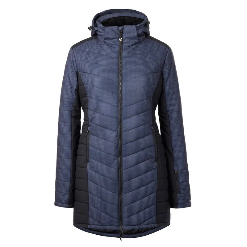 Updated with stylish mini houndstooth, the strategic design and a quilted chevron pattern combine for a slimmer, more functional silhouette. Wind and water-resistant exterior protects the 200-gram poly-loft insulation in a mid-thigh length, with back pleat that zips open for in-saddle performance. The insulated hood, cozy plush interior collar, and inner storm cuffs provide extra protection from driving winds.