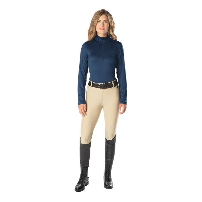 The whisper-light fabric provides UPF+30 sun protection and stretches with every move, while the Ice Fil in this long sleeve shirt keeps riders cool by lowering skins surface temp by up to five degrees. Ten-inch zip collar adds additional ventilation while the sporty, feminine fit, and equestrian hem flatter.