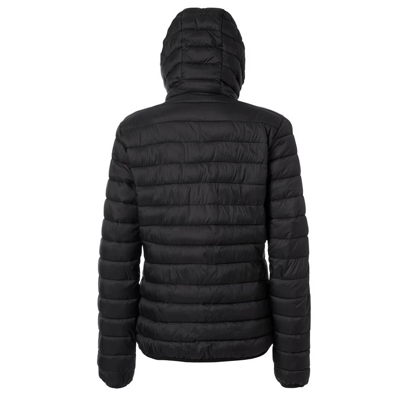 Super lightweight and warm jacket with fold-able hood, flattering quilt lines and zip pockets.
