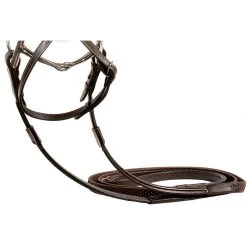 This bridle features a soft padded inlaid crown, fancy stitching, padded and raised browband. The same fancy stitching is carried through on the figure 8 as well as the matching soft grip reins that come with the Stephania.