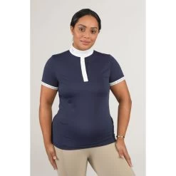 This stretch show shirt features a button tab front closure with tab collar. It is short sleeved, ideal for hot summer show days. The lightweight stretch fabric is form fitting, so it is smooth under your show coat. Colors have contrast white, or opt for the solid white version.