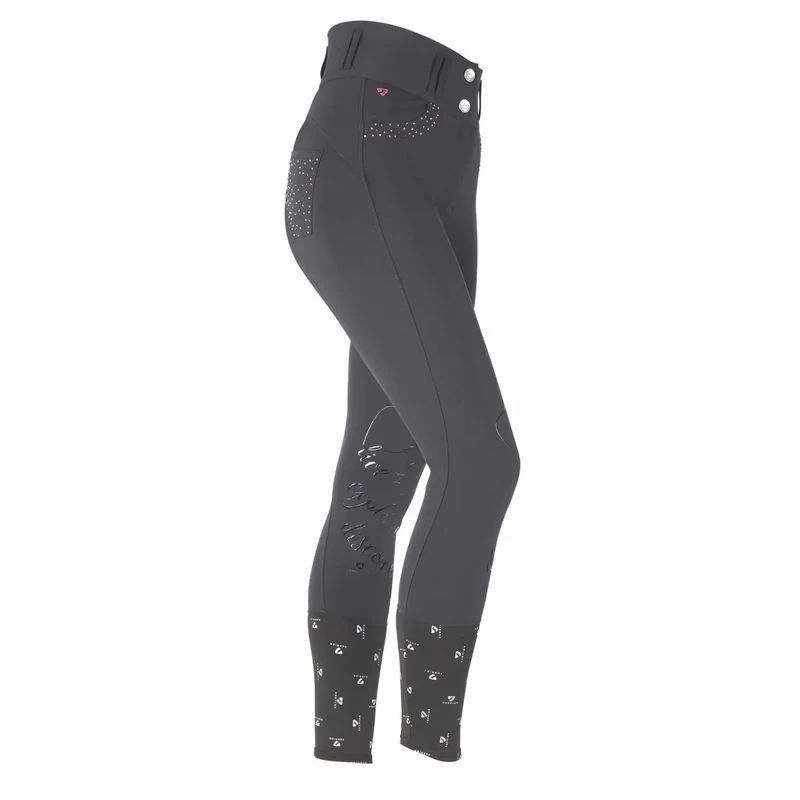 These breeches are high-waisted, with silicone knee grips. They have belt loops, a zip fly and double glitter enamel buttons. The jean style pockets are accented with diamante and silver trim. The sleek cuffs bottoms have Aubrion prints, and are super easy to slide into boots.